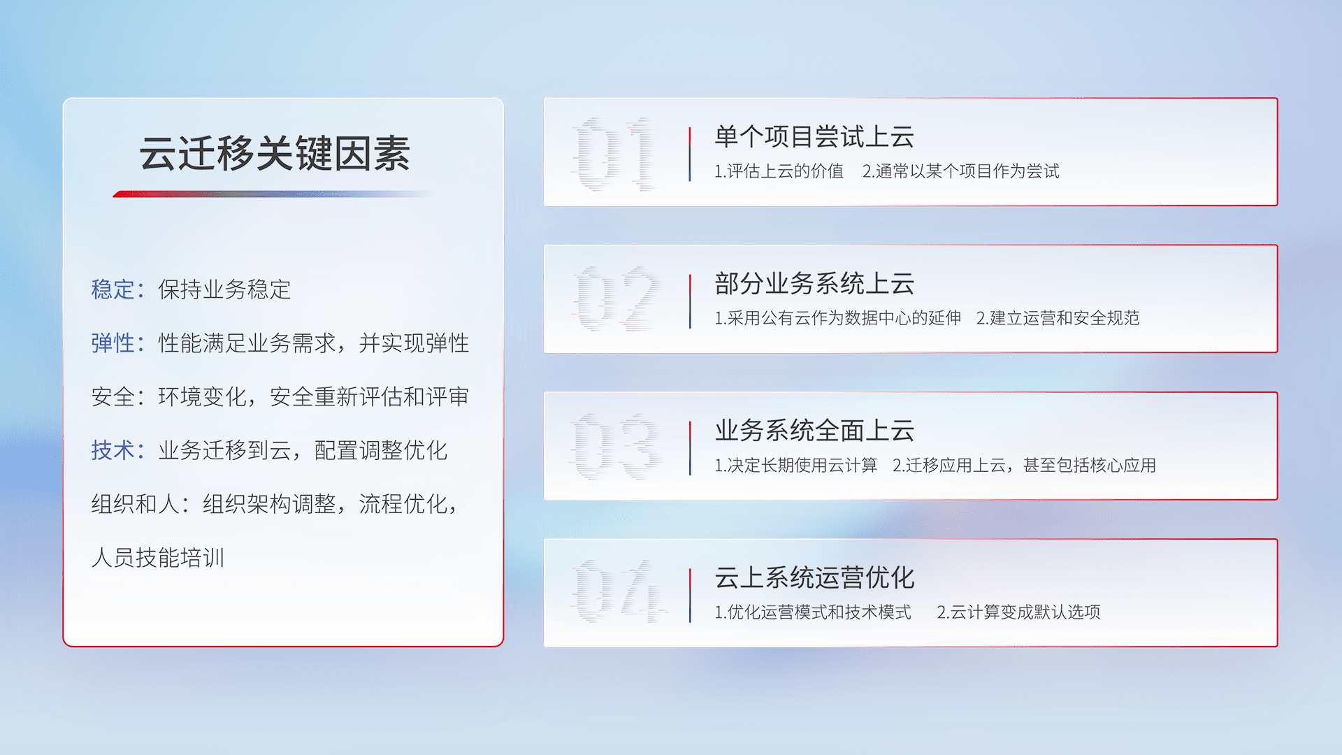 结合实际业务,,,,从规划设计、、、、云平台选型、、、、云原生改造、、、、数据迁移、、、、集成交付,,,迁移全过程为客户识别最佳上云路径,,做好风险识别管理,,设计网络架构、、身份权限、、安全审计合规、、、操作审计、、、、日志审计、、监控告警策略、、、多站点容灾设计等,,,对云上基础设施进行整体规划,,,提升IT治理水平,,以满足弹性、、、高可用、、、、高性能的需求。。。。
