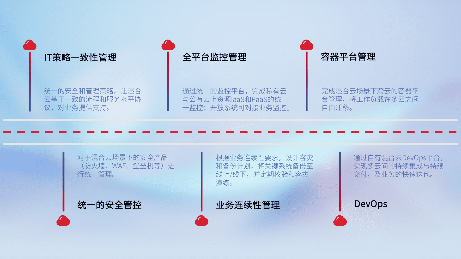 通过多云纳管,,,,以统一的资源数据模型把客户的云资源进行抽象和封装,,,进而实现对多云资源的统一操作,,保障云资源管理的可靠性、、、、稳定性与可用性。。。量身定制化运维内容,,配置、、开发运维、、补丁管理、、、备份、、、监控、、、认证和访问管理、、、审计和日常巡检等,,,保障在用云过程中的可靠度,,,,稳定度以及高可用率。。。