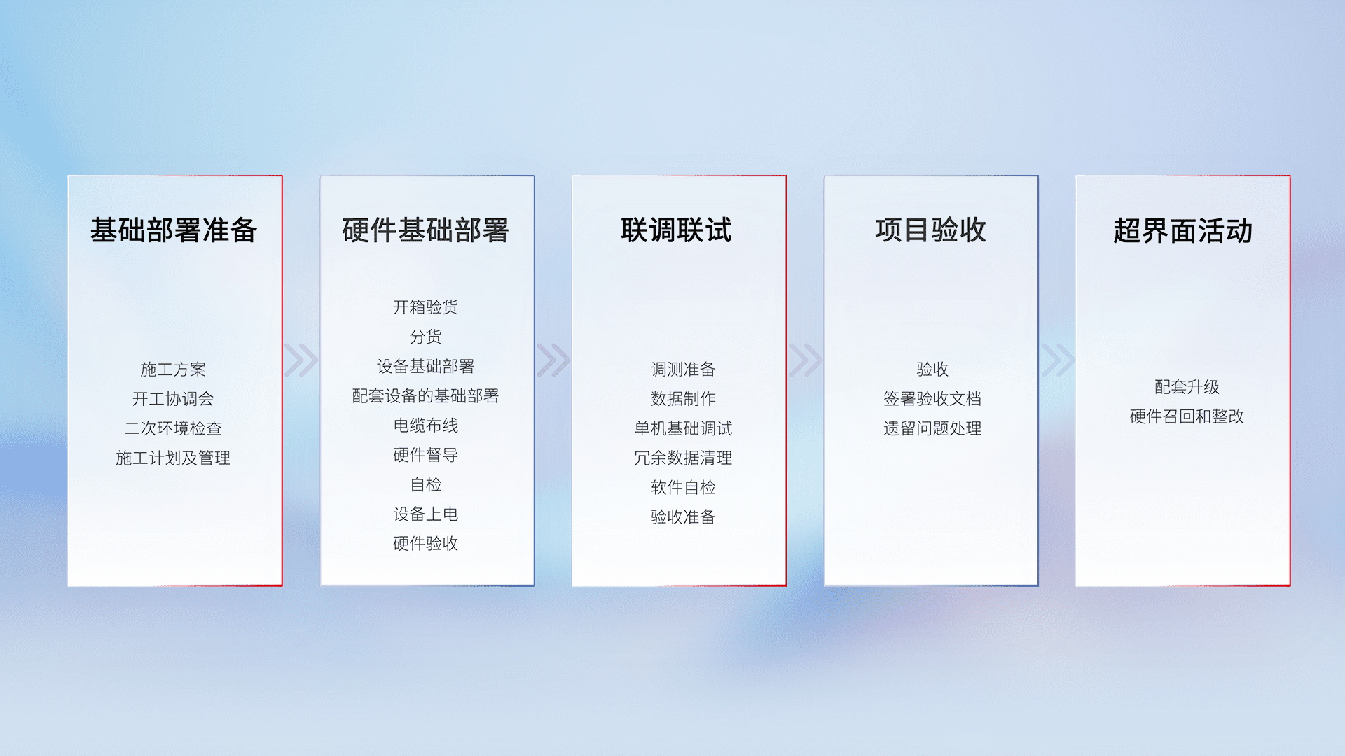 从基础部署准备、、硬件基础部署、、、联调联试、、、、项目验收、、越界面活动的全过程可追溯,,保证施工质量和进度。。。