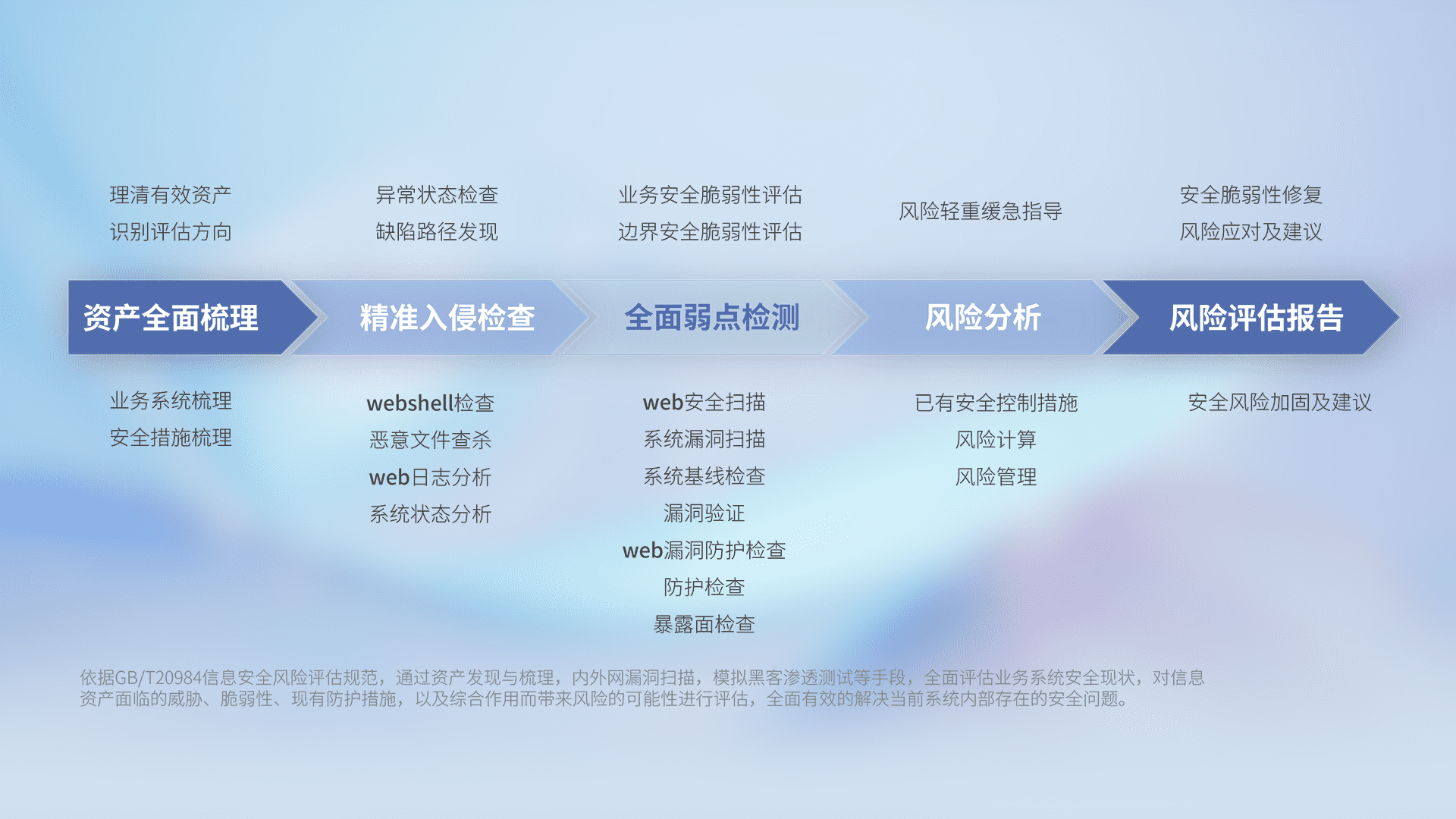 针对客户行业特性,,以专业的安全服务+多厂商联合解决方案提供专属的一站式安全管理服务,,,,帮助客户全面感知网络空间威胁,,基于识别、、、、检测、、、、分析、、防护、、、、监测、、、、响应的服务理论模型,,,,从方案咨询、、集成交付、、、评估验证、、、优化加固、、、、运维运营,,,致力于为客户提供完整的闭环管理式安全服务。。。以实战经验为客户打造高抵御风险的安全体系,,帮助客户发现威胁、、、、对抗威胁、、、、处置威胁,,,不断积累安全对抗能力,,,,持续保障数字化安全。。。。